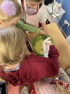 Die andere Gruppe stellte mit einer Quetsche eigene Haferflocken her. Danach wurden noch fleißig Äpfel und Birnen klein geschnitten, Sonnenblumenkerne und Milch hinzugefügt und fertig war das selbstgemachte Müsli. Am Schluss wurde natürlich alles gegessen und wie immer waren sich alle einig: Gesund kann so lecker sein!