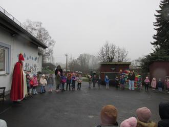 So hatte er es in einem Brief, den er letzte Woche an die Kinder schrieb, gewünscht. Gemeinsam kamen dann die Pfiffikusse mit ihm im Kindergarten an. Hier warteten schon alle Groß und Klein sehr gespannt auf sein Kommen.