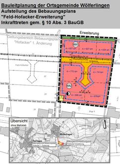 Der Bebauungsplan „Feld-Hofacker-Erweiterung“ wurde in der Sitzung des Ortsgemeinderates Wölferlingen vom 31.08.2022 gemäß § 10 Abs. 1 des Baugesetzbuchs (BauGB) als Satzung beschlossen. Dieser Beschluss wird hiermit gemäß § 10 Abs. 3 BauGB ortsüblich bekannt gemacht.