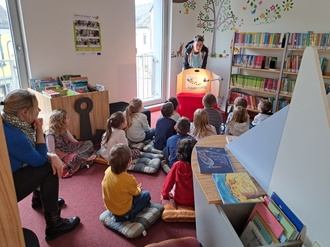 Diese hatte zu Beginn für alle Vorschulmäuse ein Spiel vorbereitet: Es sollten viele Buchstabentafeln (z.B. in den Bücherei-Regalen) gesucht werden und daraus entstand eine lange Alphabet-Reihe. Danach fanden alle einen Sitzplatz und der rote Vorhang am Kamishibai ging auf. Das Bilderbuch „Ginpuin: Auf der Suche nach dem großen Glück“ (von Barbara van der Speulhof) stand in diesem Jahr auf dem Programm. Das war eine Geschichte vom Liebhaben und Anderssein, vom Suchen und Finden... die Hauptfigur darin war ein kleiner Pinguin, der sich was traut.