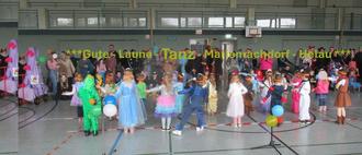 Mit Trommeln zur Faschingsmusik eroberten die Kindergartenkinder anschließend die geschmückte Narhalla an der Grundschule. Dort wurden sie bereits von weiteren Gästen erwartet, die den Kindern einen begeisterten Empfang bereiteten. Die kleinen Redner begrüßten die zahlreichen Gäste und führten durch das Programm. Mit dem Gute-Laune-Tanz, dem lustigen Tanz von Clown Pirelli und dem gemeinsamen Boogie-Woogie-Tanz sorgten die Kinder für gute Stimmung und ernteten Applaus vom Publikum.