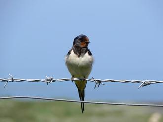 Rauchschwalbe auf Stacheldraht.