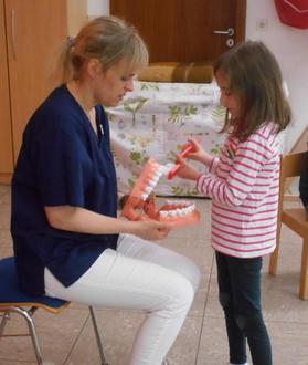 Anfang Mai erwarteten die „Schlauen Füchse“ Besuch von Zahnärztin Jennifer Konze aus der Praxis „Die Zahnärzte“ in Hundsangen. Im Beisein von „Max Schrubbel“ unterschieden die Kinder zunächst zwischen gesunden und weniger gesunden Nahrungsmitteln, bevor es mit dem „Zahnputz-Training“ am Zahn-Modell weiterging.