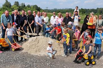 Zusammen mit einem Teil der Kinder aus der Kita St. Gangolf Meudt, der Leiterin Frau Julia Menges, den Mitarbeiterinnen der Kita und dem Elternbeirat konnte am Freitag, den 7. Juni 2024 um 15.30 Uhr der erste Spatenstich am Bauplatz der neuen Kita St. Gangolf begangen werden.