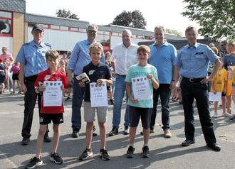 Gewinner: Gabriel Türk (vorne links) von der Sonnental-Grundschule in Langenhahn freute sich über den ersten Platz. Niclas Bendel von der Grundschule Gemünden (rechts) wurde Zweiter und Linus Garth von der Lasterbachschule in Elsoff Dritter. Zu den sehr guten Leistungen gratulierten POK Patrik Röhl (hinten von links), die VG-Bürgermeister Markus Hof, Klaus Lütkefedder und Gerrit Müller sowie Polizeioberrat Norbert Skalski.