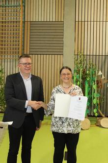 Bevor es ernst wurde, konnte sie dann aber erst einmal einen Moment durchschnaufen. Aus dem Lehrerkollegium begrüßte Frau Werner zunächst einmal die Gäste und machte sie mit dem minutiös durchgeplanten Programmablauf bekannt. Der erste Programmpunkt oblag Schulrat René Schermuly. Der begrüßte alle zu einem schönen und zugleich schmerzhaften Tag. Als Chef der Chefin ließ er den beruflichen Werdegang von Maria Rita Schröder noch einmal Revue passieren. Zunächst war Frau Schröder in Niederzissen, Westerburg und Kaden im Einsatz, bevor Sie dann am 01.02.2004 den Posten der Schulleiterin in Meudt übernahm. Nicht unerwähnt blieben auch die zahlreichen Auszeichnungen, die die Grundschule Meudt, seit 24.08.2009 als Ganztagsschule, in der Ära Schröder erreicht hat. Mit Dank für das jahrzehntelange Engagement voller Hingabe und Fürsorge überreichte er der scheidenden Schulleiterin die Versetzungsurkunde in den wohlverdienten Ruhestand.