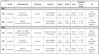 | Kursgebühr: | 15 € ab 5 TN, 11 € ab 8 TN |