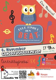 Auf Einladung des Kulturfördervereins Wallmerod e.V. kommt nach fünf ausverkauften Vorstellungen im April und Mai 2023 im Bürgerhaus Elz das Kindermusical „Eule findet den Beat“ in der Inszenierung der internationalen Theatergruppe Pinocchio ´90 e. V. im November nach Meudt in die Gangolfushalle: