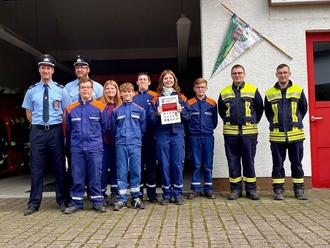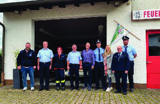 V.l.n.r.: Christian Gelhardt (stellv. Wehrleiter), Franz Schönberger (für den Brand- und Katastrophenschutzinspekteur, den Landrat, sowie die Kreisjugendfeuerwehr), Alexandra Zeyda (für den Kreisfeuerwehrverband), Ansgar Schmidt (Verbandsgemeindejugendwart), Klaus Lütkefedder (Verbandsbürgermeister), Matthias Gottschalk (Wehrführer Feuerwehr Bilkheim), Natalie Hertrich, Michael Dünnes (Gründungsmitglieder der Jugendfeuerwehr), Thomas Sehner (Jugendwart der Feuerwehr Bilkheim)