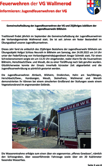 Dieses Jahr fand sie anlässlich des 25-jährigen Bestehens der Jugendfeuerwehr Bilkheim am Übungsobjekt Hofgut Schloss Neuroth in Bilkheim am Samstag, den 24.09.2022 um 14 Uhr unter der Federführung von Verbandsgemeindejugendwart Ansgar Schmidt statt. Für einen Schreckensmoment sorgte ein um 13.25 Uhr eingehender, realer Alarm für die Feuerwehren Bilkheim, Herschbach/Oww. und Meudt, die zu einer Türöffnung nach Salz gerufen wurden. Glücklicherweise konnte der Einsatz innerhalb kürzester Zeit abgearbeitet und die Jugendfeuerwehrübung so pünktlich gestartet werden.