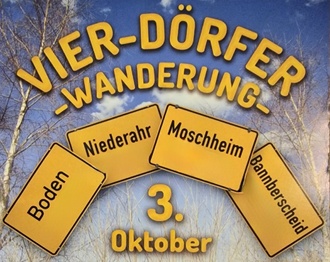 Liebe Wanderfreunde, auch in diesem Jahr findet am 03. Oktober die inzwischen schon traditionelle Vier-Dörfer-Wanderung statt. Die 4 Orte Boden, Niederahr, Moschheim und Bannberscheid, aus 3 unterschiedlichen Verbandsgemeinden, laden wieder herzlich dazu ein.