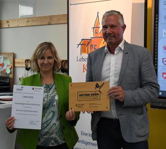 Umweltministerin Katrin Eder ließ es sich nicht nehmen, die Verbandsgemeinde Wallmerod persönlich als „Aktion Grün Kommune“ auszuzeichnen und konnte dazu viele Gäste in der Ahrbachgrundschule in Niederahr begrüßen. Seit nun mehr zwei Jahren verfolgt die Verbandsgemeinde flächendeckende eine Biodiversitätsstrategie. Gemeinsam mit der Masgeik-Stiftung hat die Verbandsgemeinde hierzu insgesamt 275 Maßnahmen an mehr als 200 verschiedenen Standorten erarbeitet. „Eine Besonderheit, die Maßstäbe setzt, ist, dass fast ein Drittel der Vorhaben bereits parallel zur Planungsphase umgesetzt wurden“, hob Ministerin Eder hervor. „Der Klimawandel und das Artensterben hängen eng miteinander zusammen. Sie bedingen sich gegenseitig und können deshalb nur gemeinsam gelöst werden“, verdeutlicht die Ministerin weiter. Als „Aktion Grün“ Kommune wird jedes Jahr eine Kommune ausgezeichnet, die sich herausragend in den Bereichen Umwelt und Artenschutz engagieren. Insgesamt wurde mit der Verbandsgemeinde Wallmerod nun erst die sechste Kommune ausgezeichnet. „Die Auszeichnung verstehen wir als Anerkennung für die vielfältigen Aktivitäten der Verbandsgemeinde Wallmerod im Bereich Klima-, Natur- und Umweltschutz. Mit unserer Biodiversitätsstrategie haben wir einen Leitfaden für zukünftige Maßnahmen unserer Gemeinden, Schulen und Privatpersonen. Wir sind froh, dass sich alle 21 Ortsgemeinden und alle unsere Schulen, einige Vereine und Gruppen sowie viele Bürger und Bürgerinnen an der Umsetzung beteiligen“, sagte Bürgermeister Klaus Lütkefedder.