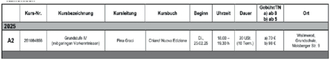 | Kursgebühr: | 47 € ab 8 TN, 66 € ab 5 TN, |