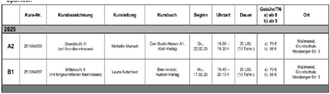 | Kursgebühr: | 30 € ab 35 TN, 50 € ab 20 TN |