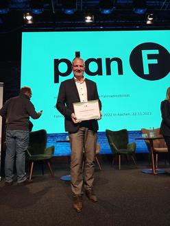 Bürgermeister Klaus Lütkefedder nimmt den Plan F Award auf der Fahrradkommunalkonferenz in Aachen entgegen