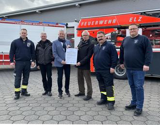 Pressefoto: Klaus-Dieter Häring - Von links, Wehrleiter Matthias Kremer, Abteilungsleiter Feuerwehr Markus Schmidt, Bürgermeister Klaus Lütkefedder, Bürgermeister Horst Kaiser, Wehrleiter Hilmar von Schenck, stellvertretender Wehrleiter Dominik Hundsänger
