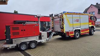 Notstromanhänger (60 kVA), welcher bei der Feuerwehr Langenhahn stationiert ist. Dieser wurde für einen bevorstehenden Einsatz vorbereitet. Ein weiterer Anhänger wir bei der Feuerwehr Höhn vorgehalten.