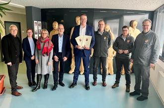 Sozialminister Alexander Schweitzer (5. von links) hat in Westerburg die Förderbescheide für das Projekt Housing First im Westerwaldkreis übergeben. Über den Besuch aus Mainz freuten sich: (von rechts) Bürgermeister Markus Hof, Martin Ortseifen und Thomas Jung von der Abteilung Soziales, Ordnung, Bildung und Kultur der Verbandsgemeinde Westerburg, Frank Keßler-Weiß, Direktor des Caritasverbandes Westerwald-Rhein-Lahn, sowie vom Diakonischen Werk Westerwald Petra Strunk (Stellvertretende Leiterin), Nadine Kröller (Housing-First-Verantwortliche) und Leiter Wilfried Kehr.
