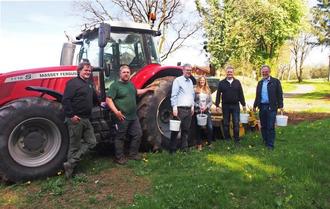 Die VG-Bürgermeister Markus Hof (Westerburg), Gerrit Mülller (Rennerod) und Andreas Heidrich (Bad Marienberg) haben schon mal angesät. Klimaschutzmanagerin Helena Frink (Bad Marienberg) unterstützt sie dabei. Links im Bild: Moritz Greiner (Mitarbeiter des Bauhofs der VG Westerburg, Freizeit und Tourismus) und Johannes Orth (Elbgrund), der Trecker und Fräse liefert, ermöglichen die Umsetzung des Projekts. (Text und Foto: Tatjana Steindorf)