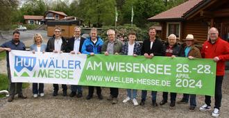 Am Wiesensee soll im April 2024 die 8. Hui-Wäller-Messe stattfinden. Stolz präsentieren Benjamin Becker, Silvia Hondrich, Bernd Kaufmann, Markus Hof, Gerrit Müller, Thomas Henritzi, Maurice Mühlenhaupt und Markus Mühlenhaupt (beide Café Seewies), Günter Preußer, Johannes Gerz und Peter Stotz das Werbebanner.