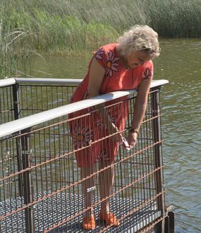Schnell war der Steg am „See“ ausgeguckt, der von einem Metallgitter gesichert ist. Ein idealer Ort, um „Liebesschlösser“ anzubringen. Zur inoffiziellen Einweihung brachte Susanne Kersten ein Vorhängeschloss ihrer Schule mit, um die Machbarkeit zu beweisen. Sie hatte die Ehre, das erste Schloss anzubringen, um danach den Schlüssel in den See fallen zu lassen. So ähnlich läuft das Anbringen von „Liebesschlössern“ auf vielen Brücken weltweit. Schmunzelnd meinte Martin Rudolph: „Wir sind doch nicht blind und wissen, dass sich gerade im hinteren Bereich des Stöffel-Parks in der Nähe des Sees häufig Paare treffen, um …. die schöne Aussicht zu genießen. Nun haben sie ab sofort die Gelegenheit, ihre Liebe für immer am Gitter festzumachen.“ Ganz sicher können die Schlüssel nicht mehr aus dem See geholt werden, da sie hier mit Argusaugen von den riesigen Karpfen bewacht werden. Rudolph hofft sehr, dass nach und nach viele „ Liebesschlösser“ den Steg zieren werden. (wr)