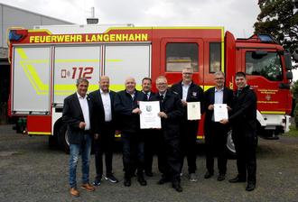 Auch wenn Michael Kaiser nicht zu den Aktiven zählt, so wurde er dennoch zum Schirmherrn befördert. Er freute sich über diese besondere Ehre und bedankte sich mit großem Respekt bei allen Wehrleuten für deren freiwilligen Einsatz. Auch er hielt Rückblick auf die anfängliche Ausrüstung, die aus einem Leiterwagen mit Wasserfass bestand. „Möget ihr alle gesund von Euren Einsätzen zurückkommen“, wünschte er den Jubilaren und auch den übrigen Wehren in die Runde. Der Bürgermeister der Verbandsgemeinde Westerburg, Markus Hof, gratulierte gemeinsam mit Wehrleiter Peter Baumann. „Glückwunsch zum 100. Geburtstag und ein herzliches Dankeschön für 100 Jahre ehrenamtliche Tätigkeit für die Region“, so Hof. Als Stützpunktwehr habe der Löschzug Langenhahn einen vielfachen Dienst. In hauptamtlicher Tätigkeit sei die Arbeit der vielen Frauen und Männern in den örtlichen Wehren unbezahlbar, hob der Bürgermeister als Träger der Freiwilligen Feuerwehren in der Verbandsgemeinde hervor. Es sei wichtig, dass die Wehren gut ausgestattet seien. Die Ausstattung sei kein Spielzeug; vielmehr diene sie dazu, Leben und Material zu retten und den Feuerwehrleuten Schutz zu bieten. „Hierfür ist kein Preis zu hoch!“, betonte Hof. Der Neubau von Feuerwehrgerätehaus und Bauhof sei beispielgebend, auch als Grundlage für weitere Planungen. Als Zeichen des Dankes und der Anerkennung überreichte Hof neben einem Geschenk auch eine Urkunde.