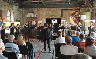 Schüler des Landesmusikgymnasiums Rheinland-Pfalz, Montabaur (LMG) traten zunächst mit drei Ensembles im Stöffel-Park auf - und zwar an verschiedenen “Hörplätzen”. Der Eintritt war für die Besucher sogar frei. Das Gitarrenensemble „Cantomano“ ist preisgekrönt und stand kurz vor seiner Konzertreise nach Griechenland. Geleitet wird es von dem hervorragenden Gitarristen Volker Höh. Sie beeindruckten mit ihren warmen und harmonischen Klängen im Tertiärum. Sängerin Lisa Wunderle trat für Lieder wie „No roots“ und „All about that bass“ ans Mikrofon. Das Blechbläserensemble unter der Leitung von Martin Balser stand auf der Basaltbühne bereit und spielte Titel wie ein munteres Preludio Nr. 1 von Fünfgeld und lockere und swingende Titel, etwa „Yellow Submarine“. Das Querflötenensemble „flautastique“ beweist immer wieder sein Können und überzeugte auch die Gäste im Stöffel-Park. Seine Leiterin ist Karoline Schaeferdiek. Auch ein modernes Stück hatten die Schüler zu bieten: Ian Clarkes „Within“ lebt von lautmalerischen Elementen. Klänge wie Wind und Bienengesurre, kratzende Geräusche oder stark rhythmische Einschübe gehörten zum Vortrag. Das war faszinierend und ein tolle Überleitung für die, die im Anschluss das dadaistische Hörstück “Pleitejazz” erleben wollten. Doch zunächst gab es viel Applaus für die Ensembles.