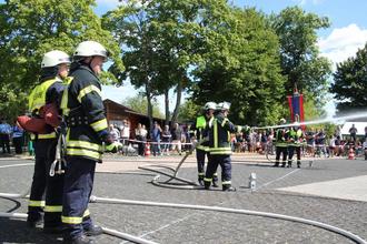 In diesem ganzen Szenario wurde ein Feuerwehrmann verletzt. Auch wenn dieser Umstand vor dem Startschuss angekündigt worden war, so war es doch für die Teilnehmer eine besondere Herausforderung. Nach gut 11 der maximal 15 angesetzten Minuten hatte die Gruppe die Übung abgeschlossen, genoss erfrischende Getränke schlüpfte in ein neues T-Shirt. Währenddessen trafen sich die Wertungsrichter, um die Punkte auszuzählen und das Geschehen zu reflektieren. Bevor sich die jeweiligen Gruppen über ihr positives Ergebnis freuen konnten, wurden Fehler angesprochen. „Jede Auffälligkeit wird erörtert, um diese künftig zu vermeiden. Wenn eine Gruppe die Prüfung nicht besteht, kann sie noch am selben Tag wiederholen“, war von einem Wertungsrichter zu erfahren. Doch an diesem Tag hatten alle Glück und die Auszeichnung, an der auch der Stellvertretende Wehrleiter Detlef Größchen teilnahm, konnte vollzogen werden. „Traumhaftes Wetter und traumhafte Leistungen“, gratulierte VG-Bürgermeister Markus Hof den Wehren. Unter dem kräftigen Beifall und Jubel der Kameradinnen und Kameraden, Familienmitglieder und Freunden wünschte der VG-Bürgermeister den glücklichen Leistungsträgern alles Gute und allen noch einen schönen Tag in Härtlingen. Die heimische Wehr hatte in diesem Rahmen einen kleinen Festplatz vorbereitet. Da gab es neben Getränken auch Leckeres vom Grill und eine Hüpfburg für den Nachwuchs. (Text und Fotos: Ulrike Preis)