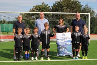 Albert Rödel (hintere Reihe von links), Günter Weigel, Tina Wiederstein und Peter Stoth freuen sich ebenso wie kleinen und großen Fußballer des TuS Westerburg auf das neue Stickeralbum.
