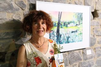 Die Künstlerin vor ihrem Aquarell „Radweg Sieg-Eitorf“