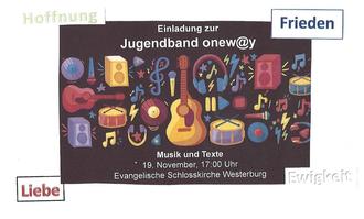Die Jugendband „oneW@y“ der Evangelischen Kirchengemeinde Westerburg lädt ganz herzlich ein, zu einer besinnlichen Stunde mit Musik und Texten über Hoffnung, Frieden, Liebe und Ewigkeit - Dinge, die wir in dieser schwierigen Zeit gut gebrauchen können.