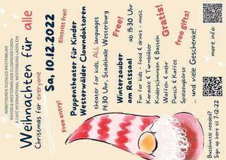 Am Samstag, den 10. Dezember wird es in Westerburg ein ganz besonderes Fest geben. Es steht unter dem Motto „Weihnachten für alle“ und soll insbesondere die Bürgerinnen und Bürger aus der Verbandsgemeinde Westerburg ansprechen, die für einen Weihnachtsmarktbesuch nur wenig oder kein Budget zur Verfügung haben. Organisiert und durchgeführt wird die Veranstaltung durch den Arbeitskreis Soziales Westerburg, die Selbsthilfekontaktstelle, WeKISS| DER PARITÄTISCHE mit ihren Westerwälder Clowndoktoren sowie den freiwilligen Helferinnen und Helfern des Café International Westerburg. International soll es auch diesmal zu gehen, deshalb sind alle Nationen herzlich eingeladen. Der Eintritt ist frei. Es gibt viele Überraschungen, Geschenke sowie Speisen und Getränke. Dabei soll es aber auch die Möglichkeit zum gegenseitigen Kennenlernen geben und die Zeit, Freundschaften zu pflegen. Finanziell unterstützt wird die Veranstaltung durch die Else-Schütz-Stiftung.