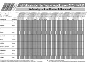Bestimmt haben Sie ihn schon gefunden, oder? Diesem Heft ist der neue Abfallkalender des Westerwaldkreis-AbfallwirtschaftsBetriebes (WAB) für das Jahr 2023 beigelegt. Der Innenteil des Abfallkalenders enthält wie gewohnt ausführliche Informationen über das Abfuhrsystem im Westerwaldkreis. Neben der genauen Beschreibung der wöchentlichen Abfuhr sind hier auch Infos zur Kühlschrank-, Elektroaltgeräte-, Wertstoffschrott- und Sonderabfallentsorgung sowie nähere Erläuterungen zur Sperrabfall- und Grünabfallentsorgung aufgeführt.