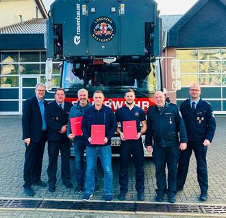 v.l.n.r.: VG-Bürgermeister Markus Hof, Wehrleiter Peter Baumann, Michael Zimmermann, Marcel Müller, Kevin Groth, stellv. Wehrleiter Detlef Größchen, stellv. Wehrleiter Matthias Helsper