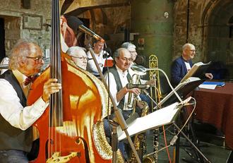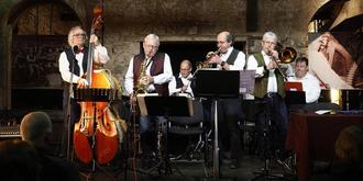 Die Westerwälder Band Schräglage steht üblicherweise mit sechs Mann auf der Bühne. Jeder von ihnen überzeugt mit seinem Können - ob die „Honeysuckle Rose“ besungen wird, der „Kleine grüne Kaktus“, „Ice Cream“ oder ob „When the saints go marching in“ erklingt. Ihre flotten Musikstücke umranken die Auftritte von Stefan Reusch.