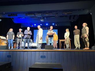 Besonders überrascht und erfreut zeigte sich Walter Sittler über die nachträglichen Geburtstagsgrüße, übergeben auf der Bühne vom Vorstand des Kulturvereins(Bernd Jung 1VS, Timo Kuhl VS, Mäggy Kern Schriftführerin, Burkhard Schuhenn, Michael Zirpel und Christin Flor Beisitzer)