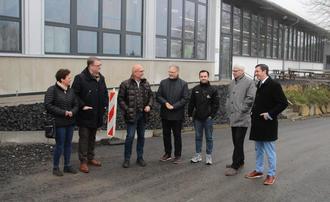 Dr. Sibylle Dünnes-Zimmermann (von links), MdEP Ralf Seekatz, Dieter Heep, Harald Orthey, Louis Heep, Dr. Stephan Krempel und Stadtbürgermeister Janick Pape vor der Hallenerweiterung bei Niveau Fenster in Westerburg.