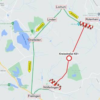 Die Arbeiten an der K61 erfolgen unter Vollsperrung und werden je nach Witterung bis spätestens Dezember 2024 andauern.
