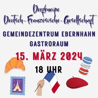 Dorfkneipe am 15.03.2024! Die nächste Dorfkneipe steht an! Die Deutsch-Französische-Gesellschaft Ebernhahn e.V. freut sich, euch am 15.03.2024 ab 18 Uhr im Gemeindezentrum zu empfangen! In den französischen und deutschen Farben wollen wir mit euch eine flotte Sohle auf‘s Parkett legen!