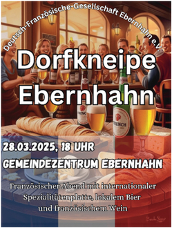 Die nächste Dorfkneipe findet am 28.03.2025 im Gastroraum des Gemeindezentrums Ebernhahn statt.
