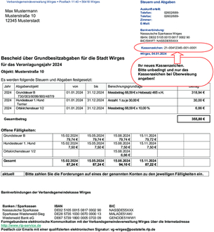 Zur Zeit werden die Bescheide für die Grundbesitzabgaben und die Verbrauchsabrechnungen versandt. Bitte bei den Überweisungen an die Verbandsgemeindekasse unbedingt darauf achten, dass auf den Bescheiden aufgeführte Kassenzeichen bei der Überweisung anzugeben. Nur so kann sichergestellt werden, dass eine ordnungsgemäße Verbuchung erfolgen kann. Vielen Dank.