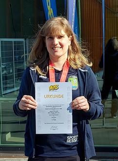 Jasmin Schmidt konnte sich, nach ihrer ersten Teilnahme an einer Deutschen Meisterschaft, am Ende des Turniers, riesig er den Titel der Deutschen Vizemeisterin DSB in der Klasse Blankbogen Damen freuen.