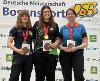 Die Siegerinnen in der Bogenklasse -Blankbogen Damen- (v. l. n. r:) Jasmin Schmidt (Deutsche Vizemeisterin), Merle Cathrin Lehmann (Deutsche Meisterin), Jennifer Lieb (Drittplatzierte)