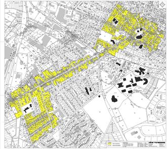 Das Satzungsgebiet umfasst im Wesentlichen den dicht bebauten historischen Ortskern im Umfeld der katholischen Kirche, den langgestreckten Bereich beiderseits der Hauptstraße bis zum Bahnhof und das dicht bebaute Quartier westlich der Hochstraße