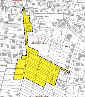 Das angedachte Umlegungsgebiet „Im Bergfeld“ ist im nachfolgenden Auszug aus den Geobasisinformationen kenntlich gemacht.