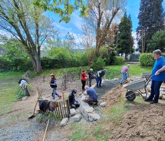 Wenn die gepflanzten Stauden und die gesäten Blumen bald noch Farbe ins Spiel bringen, ist es ein wirklich schönes Plätzchen. Auf der Blumenwiese in der Sayntalstraße ist außerdem ein Eidechsenhabität entstanden. Der geplante Kletterhang wird beim nächsten Mal angelegt.