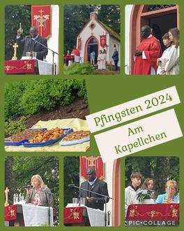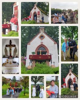 In Begleitung von einigen Aktiven des Musikvereins zog die Prozession an Pfingstmontag von der Kirche zur Kreuzkapelle. Hier standen bereits Stühle für die Besucher zur Mitfeier bereit und der Altarbereich war festlich mit Blumen und Fahnen geschmückt.