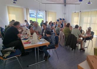 Nach einer 2 ½-stündigen Wanderung wurde die Gruppe mit einem reichhaltigen Frühstück im Geschwister-Blaum-Saal in Ötzingen belohnt. Neben dem Genuss von unter anderem regionalen bzw. selbst hergestellten Produkten wie Honig, Marmelade, Eier, Müsli, Kräuterbutter und Apfelsaft war das Frühstück geprägt von Geselligkeit und fröhlichem Austausch.