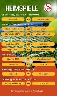 Die Tennisanlage des TC Siershahn wird in der Woche vom 12. bis 15. Juni zum Schauplatz intensiver Ballwechsel, spannender Begegnungen und sportlicher Highlights. An insgesamt fünf Spieltagen stehen gleich neun Begegnungen auf dem Programm – ein echter Tennis-Höhepunkt der Saison für alle Fans und Unterstützer des Vereins!