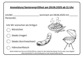 Kommt vorbei und genießt einen geselligen Tag mit leckerem Essen und Trinken, für das selbstverständlich die Gemeinde sorgt. Um die Veranstaltung besser planen zu können, bitten wir, den nachstehenden Anmeldebogen auszufüllen und bis zum 22. Juni 2025 bei Georg Holl, Conny Baldus oder Laura Schenk abzugeben. Alternativ kann der Bogen auch in den Briefkasten der Aubachhalle eingeworfen oder die Anmeldungen per Mail an georg.holl@bannberscheid.de gerichtet werden oder telefonisch an mich unter 0178 9388256.